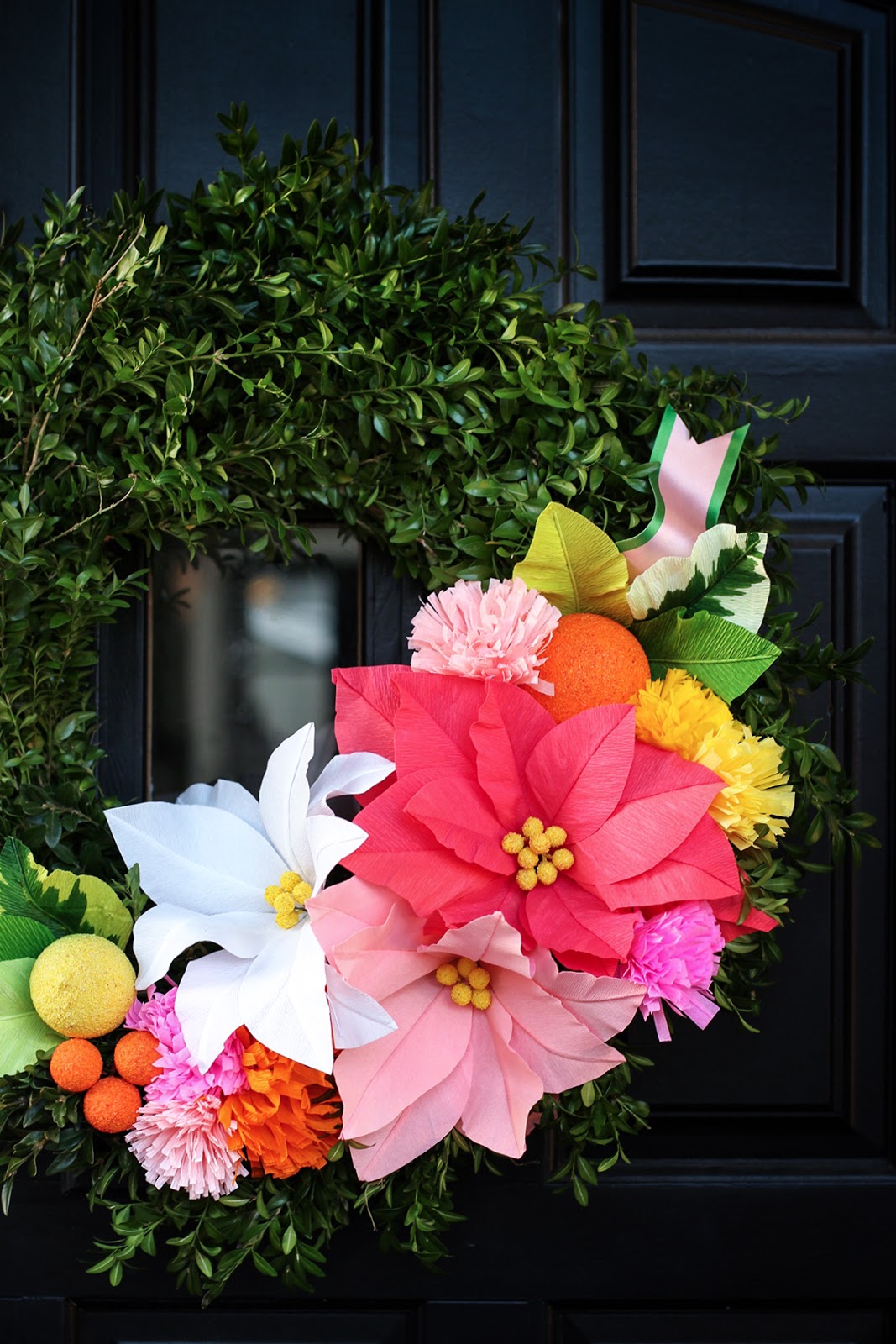It all started with a boxwood wreath from Trader Joe’s. Honestly. I’ve always loved the hardiness and rich green hue of boxwood and for $10, I couldn’t possibly pass up one of TJ’s favorite holiday offerings. But how would I use the oh too simple wreath as a foundation for something bigger, brighter and more festive? Real flowers only last a few days but ah, paper flowers . . . paper flowers could easily outlast the boxwood itself and carry me through the holidays. So I paid a visit to paper flower genius Lynn Dolan and my friends at Castle In The Air for some brilliant ideas on how to embellish my new door decor. Lynn suggested poinsettias, a Christmas classic, in a Palm Springs inspired palette. Ding, ding! And what makes this tutorial even sweeter is that poinsettias “petals” are actually leaves (the tiny yellow buds in the center are the flowers!), which means there is really only one shape you’ll need to craft out of crepe paper to make this dream a reality. Easy, peasy. Just follow along and see . . .